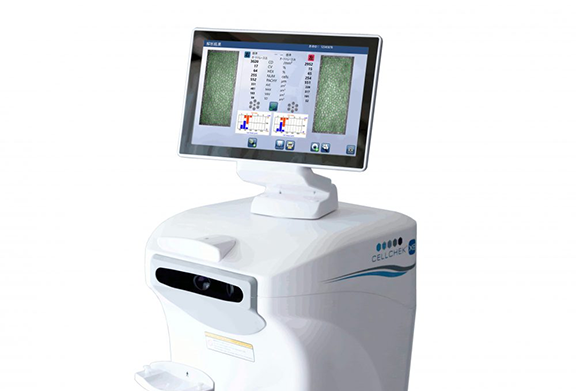 The Cellcheck (Konan Medical, USA) is a non-contact specular microscope for measurements of corneal endothelial cell density.