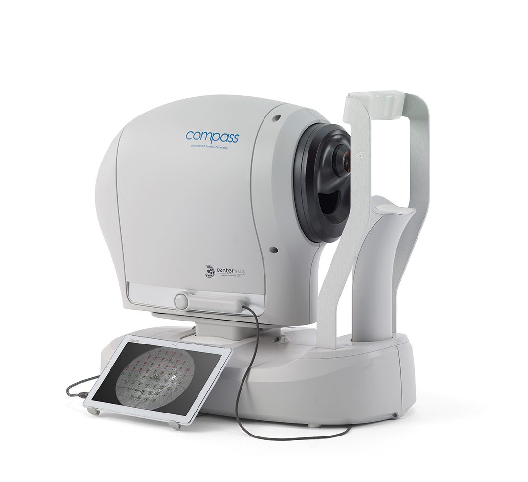 Compass (Icare Finland Oy) is an automated perimeter combined with an active retinal tracker and a scanning ophthalmoscope. This advanced technology provides retinal sensitivity and fixation analysis, as well as TrueColor Confocal imaging of the retina.