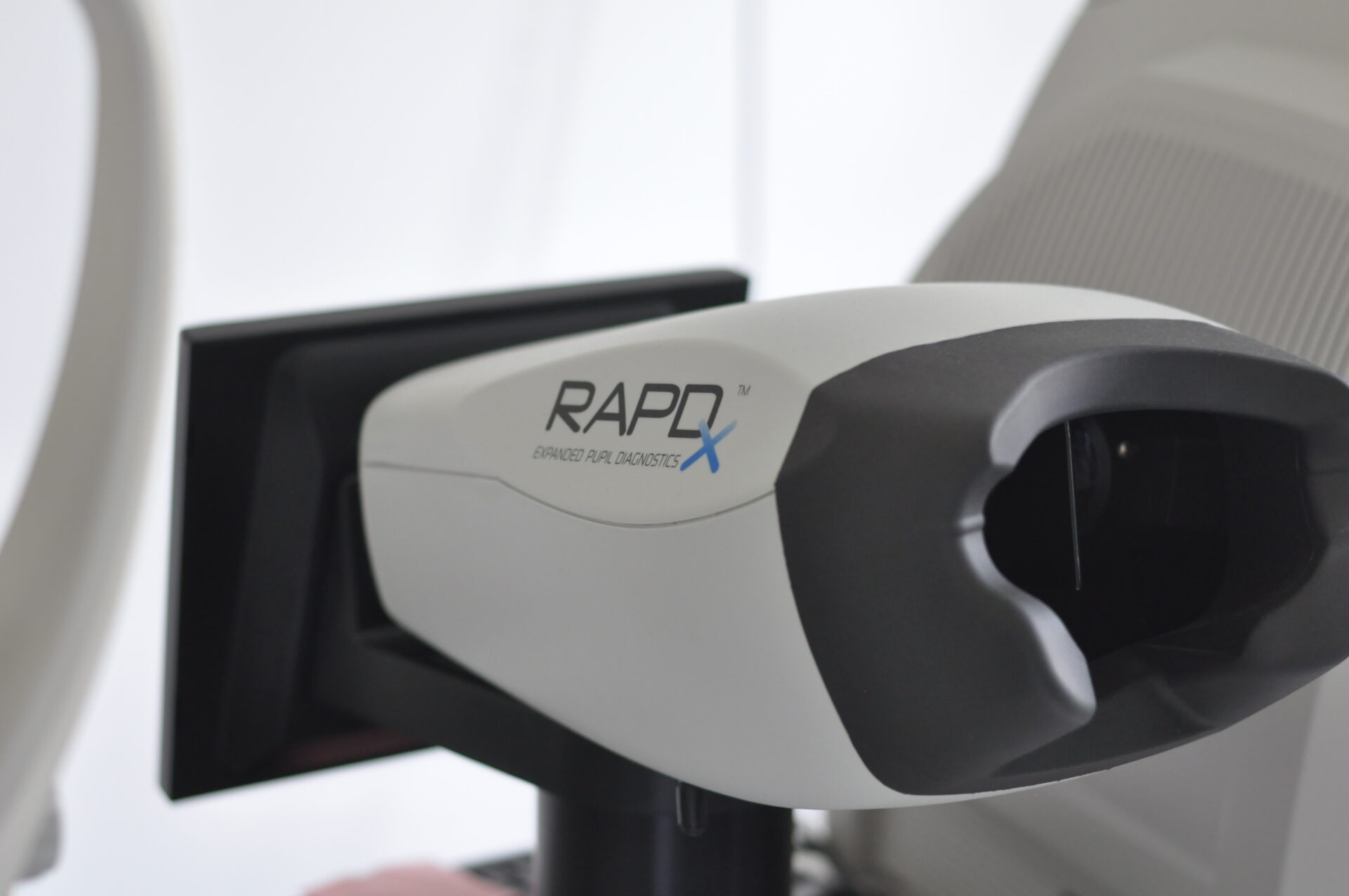 The RAPDx (Konan Medical, USA) utilizes a high-definition, machine-vision system under controlled infrared conditions to present monocular visual stimuli while recording binocular pupil responses.